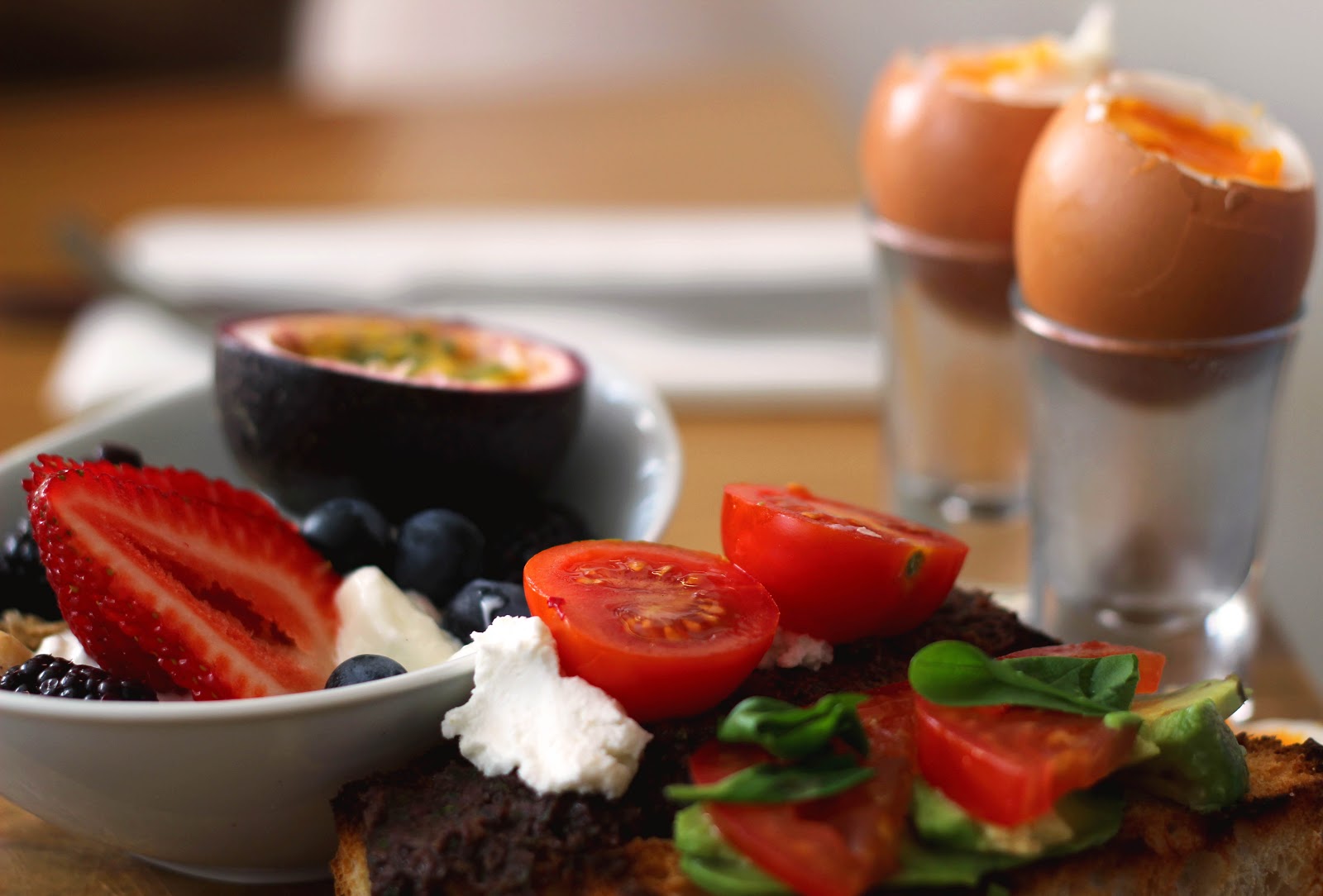 Breakfast platter with soft-boiled eggs, soldiers, muesli, baked ricotta and poached fruits.